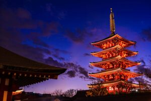 夕方から夜にかけては提灯の灯りが境内を照らし、昼間とはまた違った幻想的な雰囲気に。